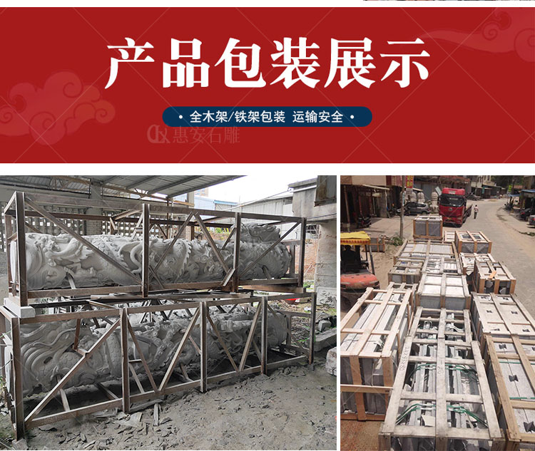 福建廠石雕龍柱產(chǎn)品構成為柱礎、柱身、柱頭(柱帽)三部分,龍柱一般為圓柱形,通身雕刻有纏柱云龍,適用于宮觀寺院、宗祠古厝、園林景觀、廣場擺件等,常用石料為花崗巖與青石。