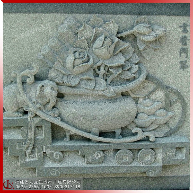 常見傳統寓意浮雕紋樣內容有:花開富貴、喜鵲報喜、丹鳳朝陽、太平有象、鹿竹同春、麒麟獻瑞、麒麟送子、松鶴延年、壽比南山、八仙祝壽、紫氣東來、五福臨門、招財進寶、吉慶有余、五谷豐登、龍鳳呈祥、平安如意、歲歲平安、年年有余等生活風俗或神話故事中富有美好寓意的吉祥圖案。